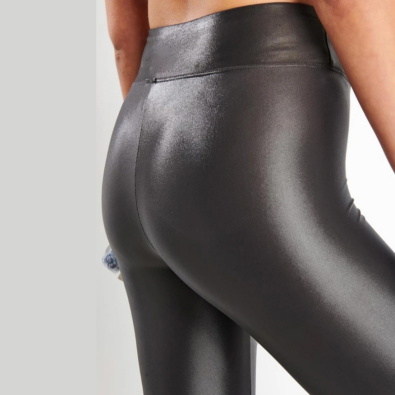 These black wet-look leggings feature a glossy, leather like finish that gives a bold and confident style. The snug and supportive waistband sculpts the waistline while the soft stretch fabric ensures freedom of movement. Ideal for dance, performance, or fitness wear, these leggings add a sleek, modern look to any outfit.