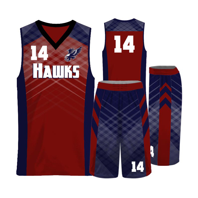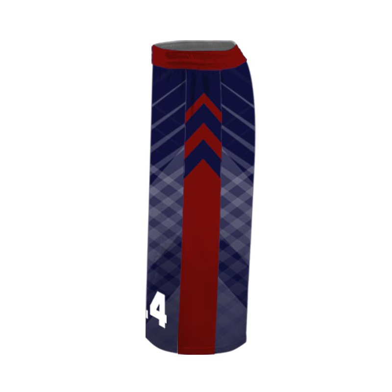 Stylish red and navy blue basketball uniform set with matching shorts. Made from breathable and lightweight fabric to keep players cool and comfortable. Features high quality stitching and moisture-wicking performance ideal for professional and school teams.