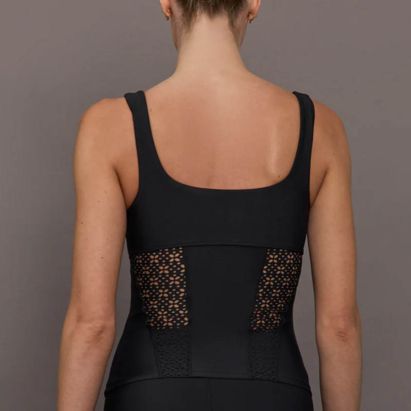 Elevate your workout with our Laser Cut Tank in Diamond Compression. Crafted from our most compressive fabric, Diamond Compression, this sleek black tank hugs your curves while providing targeted support. The laser cut detailing on the sides adds a modern, breathable edge so you can move freely and look fierce whether you’re at the gym or on the go.