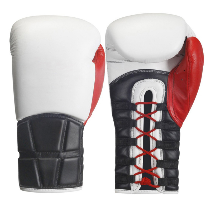 Traditional lace up boxing gloves in white and red. Provide a snug, custom fit for professional fighters. Excellent wrist support and superior control during sparring.